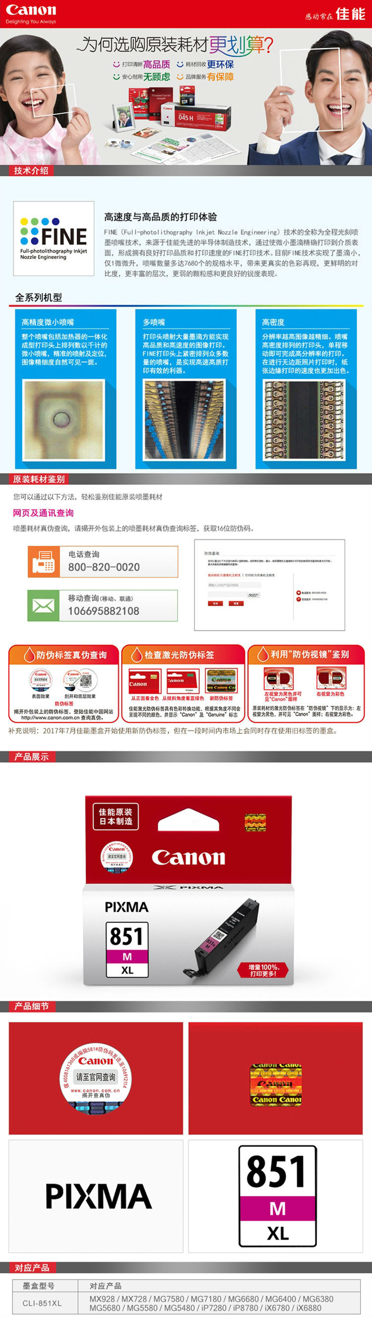 商品名称:★ 佳能/Canon CLI-851XL M 红色 大容墨盒 适用于MX928 728 MG7580 7180 6680 6400 6380 5680 5580 5480 IP7280 8780 IX6780 688 打印量670页
