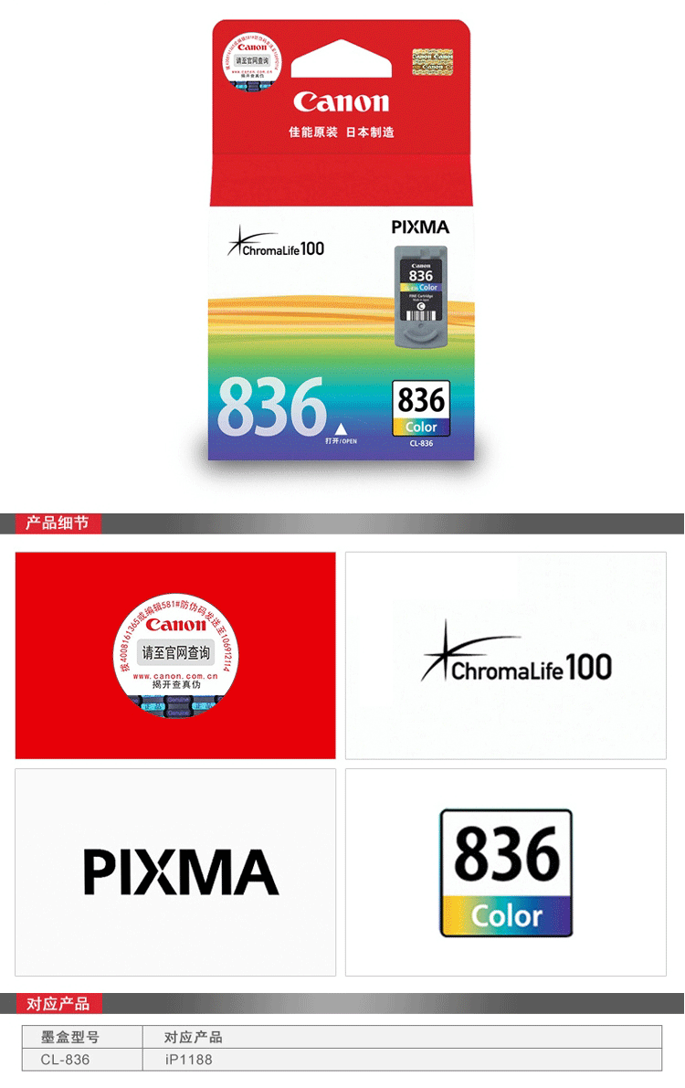 商品名称:★ 佳能/Canon 彩色墨盒 适用IP1188 打印量240页 CL-836