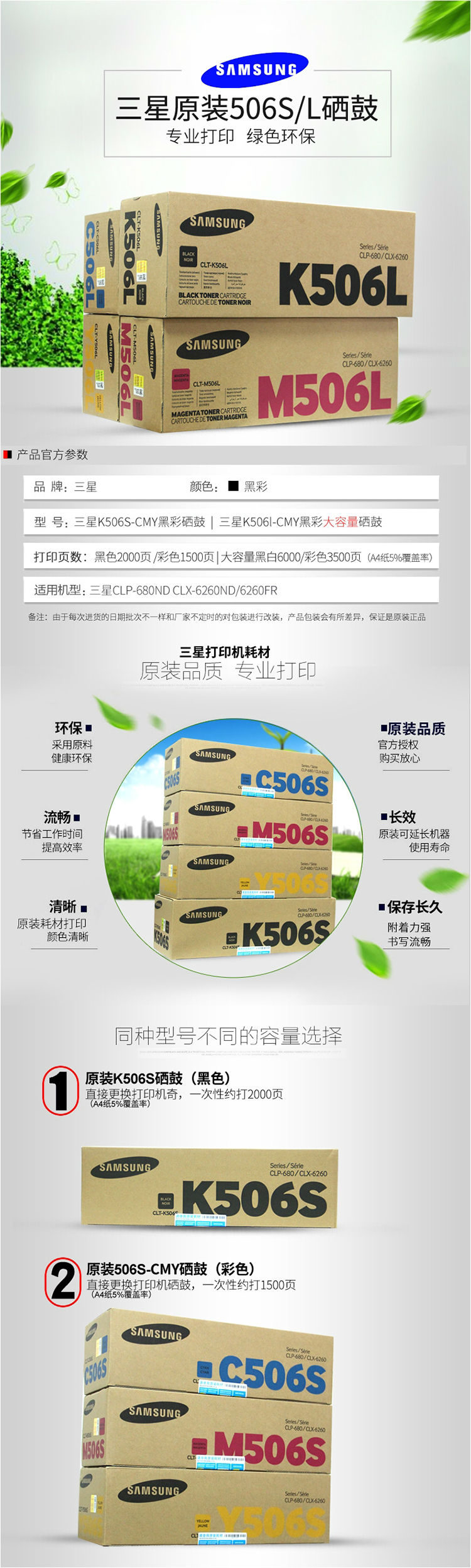商品名称:★ 三星/Samsung CLT-K506L 黑色硒鼓 大容量 适用于三星CLP-680NDCLX-6260ND 6260FR A4 5%覆盖率6000页