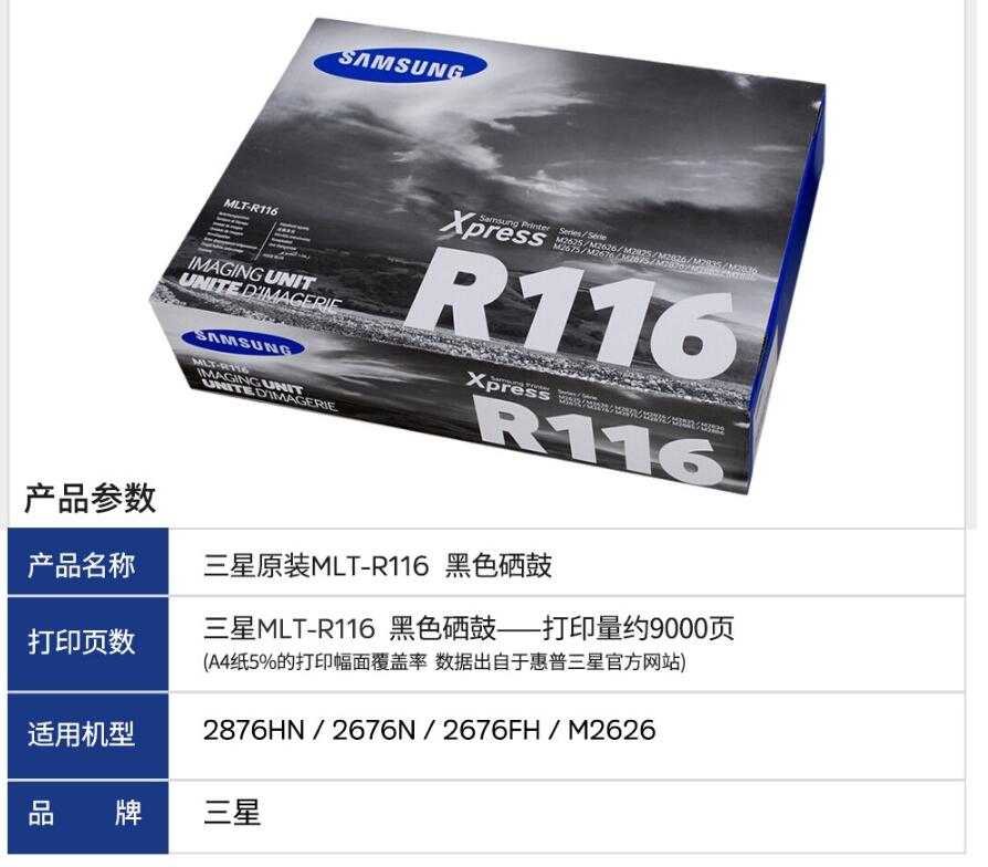 商品名称:★ 三星/Samsung MLT-R116 黑色硒鼓 适用于2876HN 2676N 2676FH M2626 A4 5%覆盖率9000页