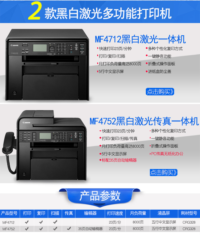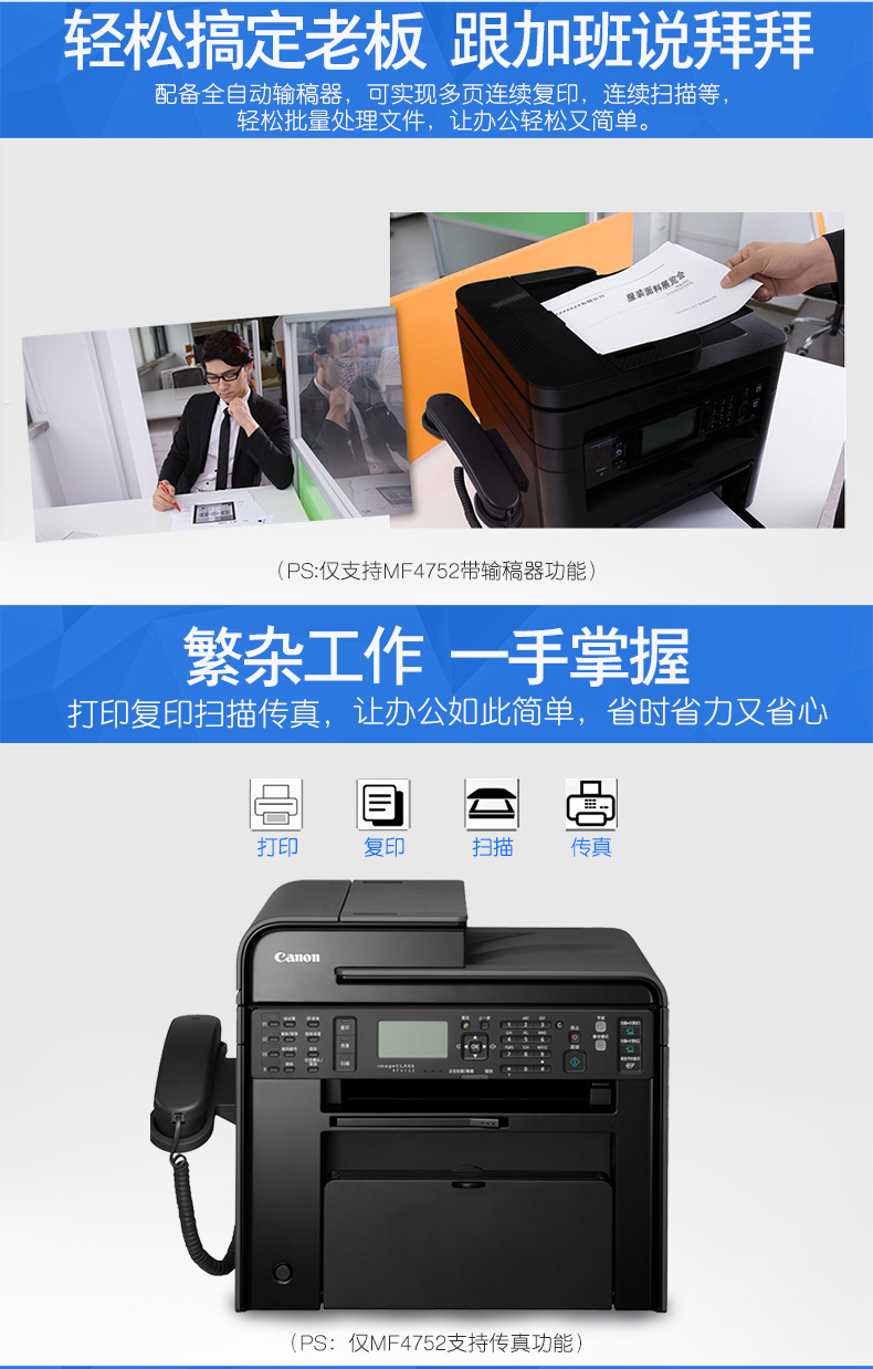 商品名称:佳能/Canon A4彩色激光多功能一体机 (打印、复印、扫描、传真)(计价单位:台) iC MF4752