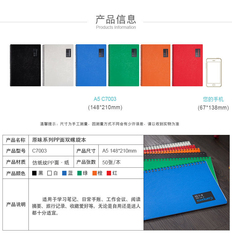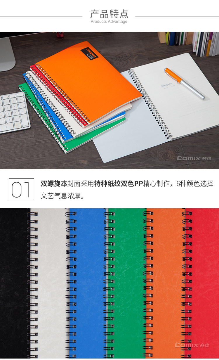 商品名称:齐心 B5 50张 Compera系列PP面双螺旋本 白 C7002