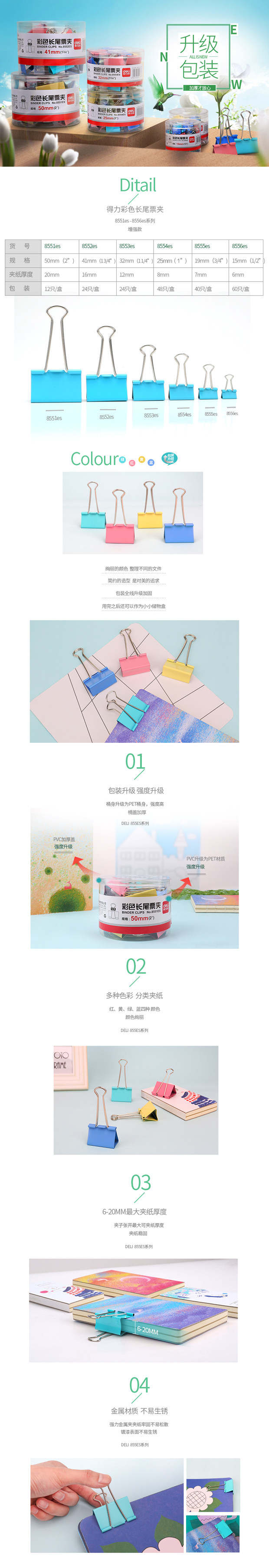 商品名称:得力/deli 32mm 长尾夹 24只/筒 彩色 8553