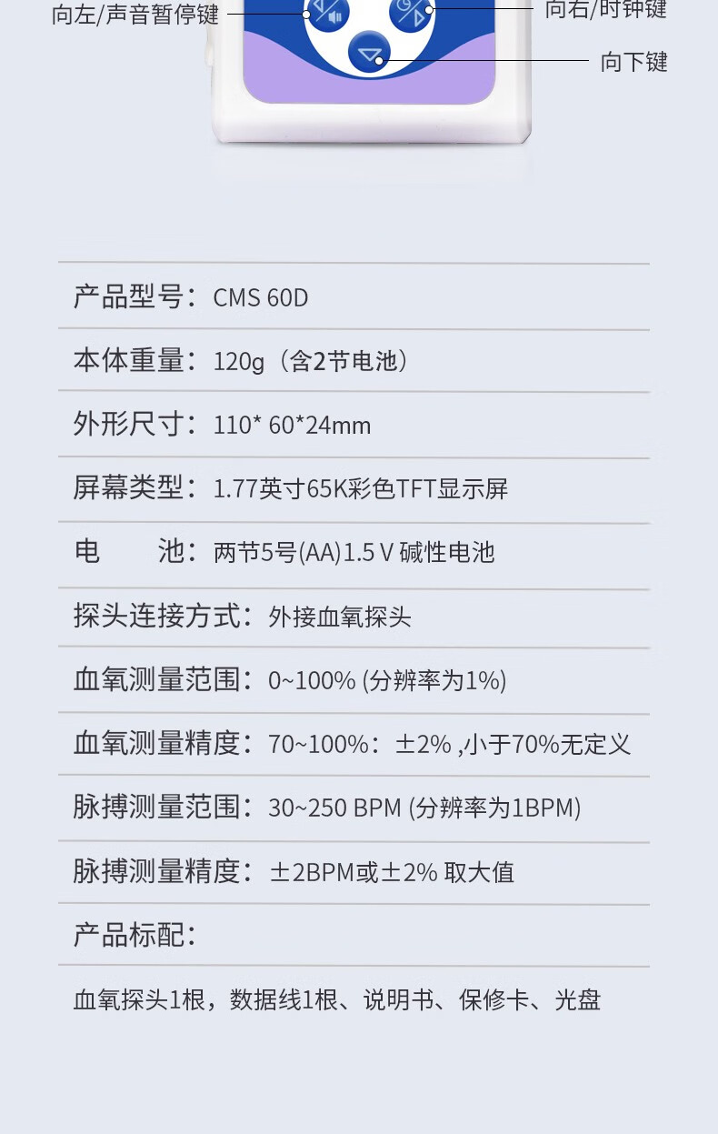 商品名称:康泰CONTEC 脉搏血氧仪 血氧饱和度检测仪 脉搏检测仪 脉氧仪 CMS60D