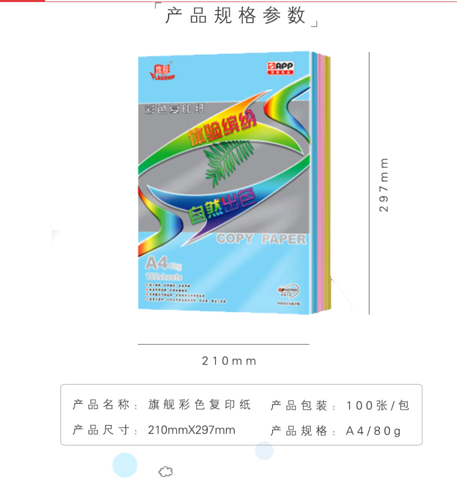 商品名称:金光(APP)旗舰彩色复印纸(FLAGSHIP)A4/80g 100张/包 单包装 浅色 淡蓝色
