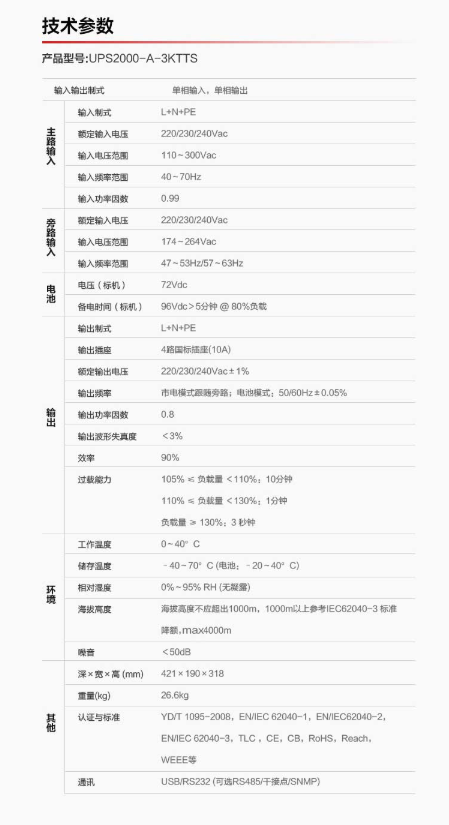 商品名称:华为 HUAWEI UPS2000-A-3KTTS UPS不间断电源3KVA/2.4KW(塔式标机,内置电池) 企业级
