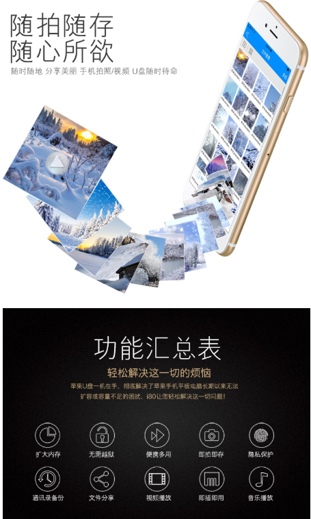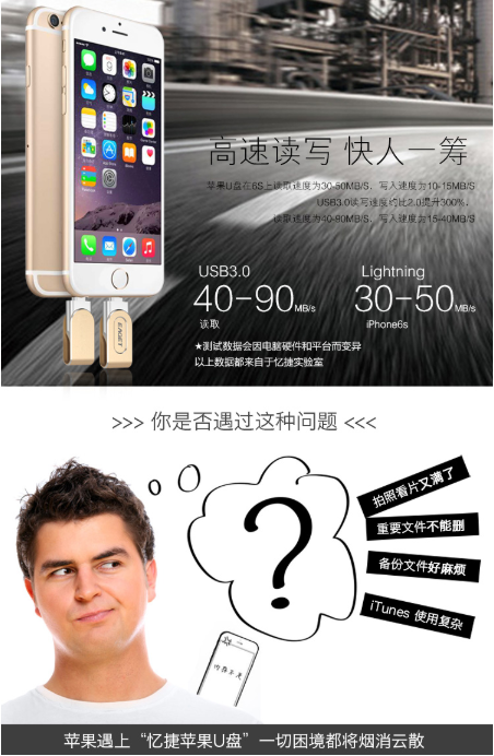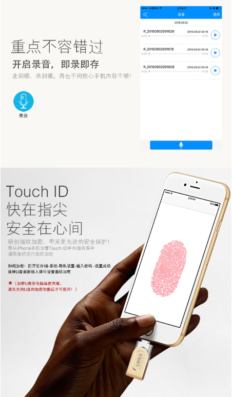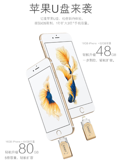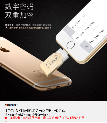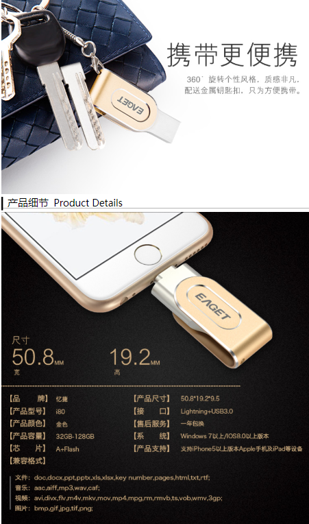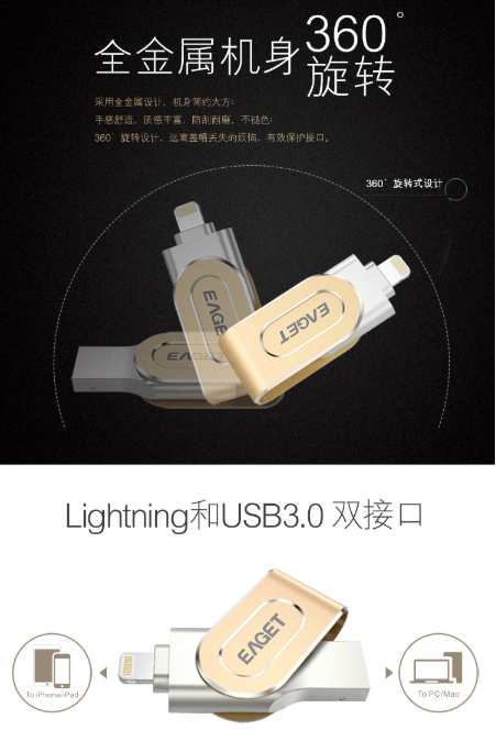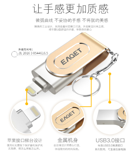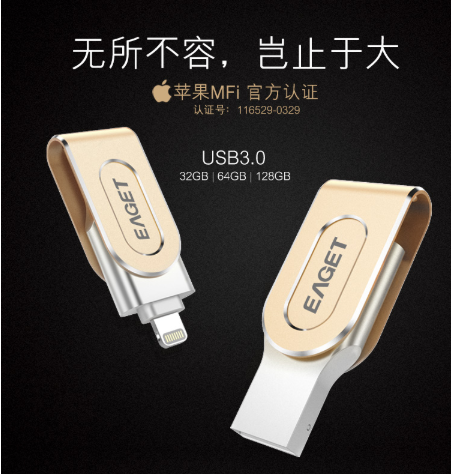 商品名称:忆捷 EAGET i80指纹加密苹果手机U盘128G美国MFI认证高速USB3.0金属iphone/ipad扩容双接口电脑两用U盘金色