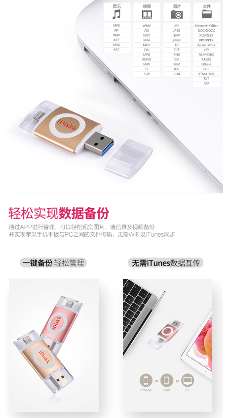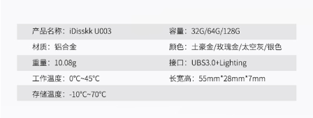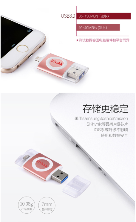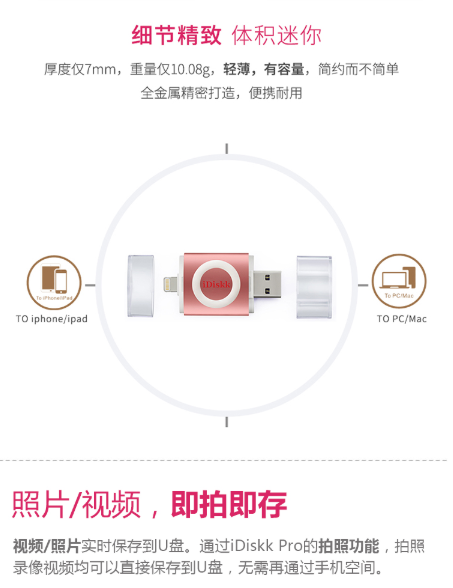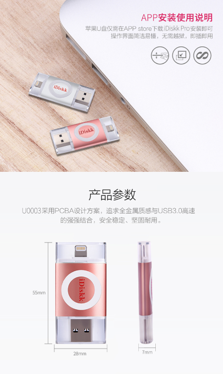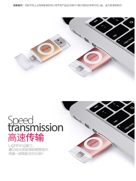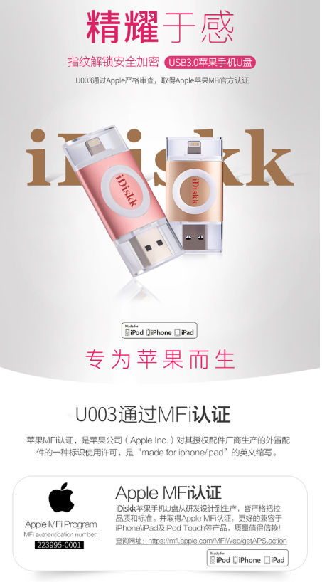 商品名称:IDISK KU003苹果手机U盘32G苹果官方MFI认证IPHONE/IPAD手机电脑两用U盘玫瑰金