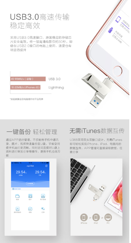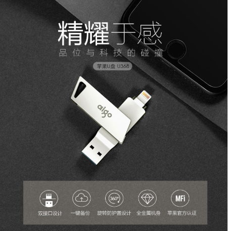 爱国者 AIGO 32G苹果手机U盘U368USB3.0苹果官方MFI认证IPHONE和IPAD双接口手机电脑用银色