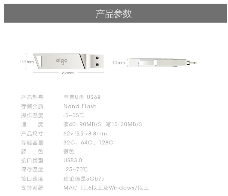 商品名称:爱国者 AIGO 32G苹果手机U盘U368USB3.0苹果官方MFI认证IPHONE和IPAD双接口手机电脑用银色