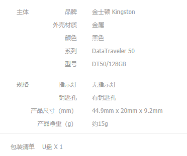 商品名称:金士顿 Kingston USB3.1 128GB 金属U盘 DT50 黑色