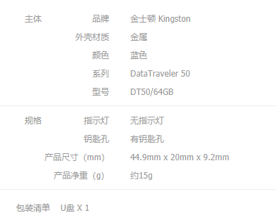 商品名称:金士顿 Kingston USB3.1 64GB 金属U盘 DT50 蓝色