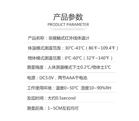 商品名称:雨花泽 非接触式红外线体温计 体温模式测温范围:30°C-43°C (86°F~109.4°F)