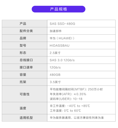 商品名称:华为 HUAWEI 480GB SSD 3.5架 ES3500S V5 服务器专用 智能计算 企业级 固态硬盘 SAS-12GB/S读取密集型2.5"