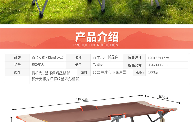 商品名称:喜马拉雅 铝合金折叠床超轻便携休闲床露营午休单人办公室午睡床咖啡色HF9528