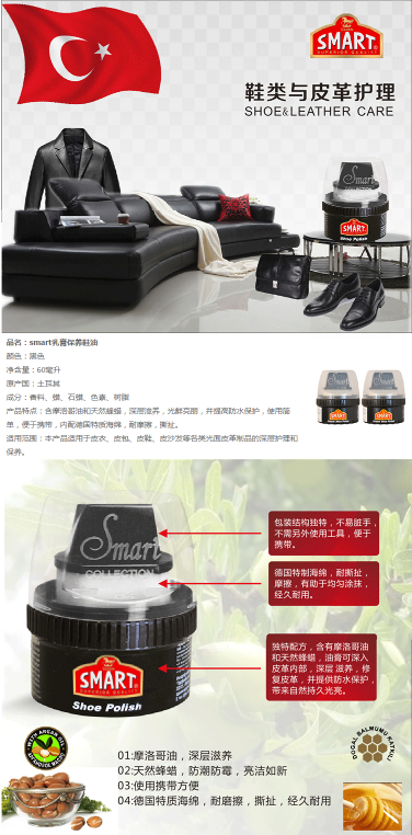 商品名称:SMART 乳膏护理鞋油黑色60ML 深层滋养 皮衣皮包皮鞋皮沙发保养 土耳其进口