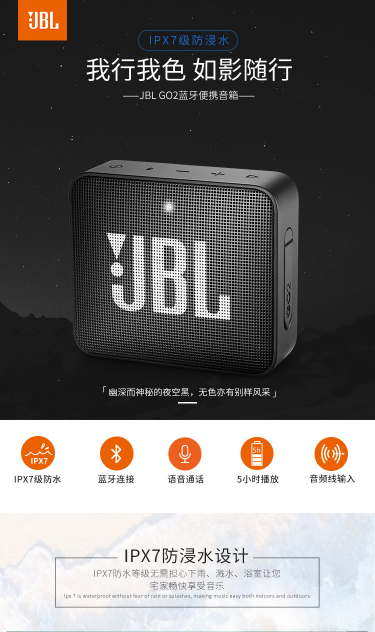 商品名称:JBL GO2音乐金砖二代蓝牙音箱低音炮户外便携音响迷你小音箱可免提通话防水设计夜空黑