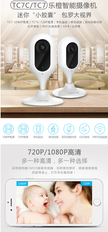 商品名称:乐橙 LECHANGE 智能WIFI摄像头TC7 家用室内大广角1080P超清红外夜视迷你卡片机 远程手机双向语音实时监控摄像机