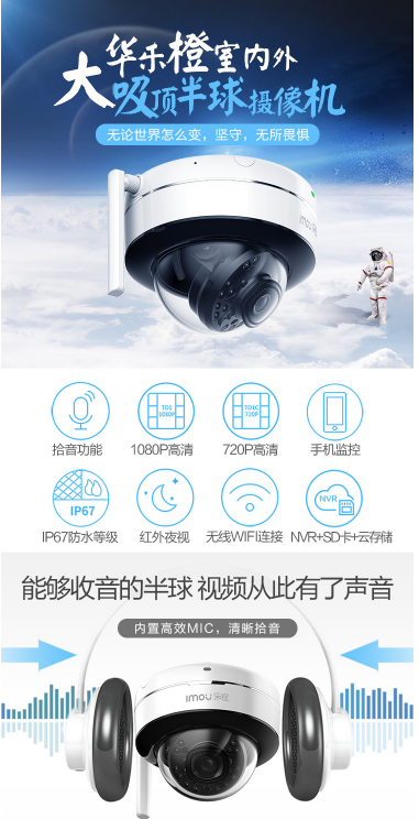 商品名称:乐橙 LECHANGE 吸顶半球拾音摄像头 TD1 2.8MM 1080P超清超远夜视 无线WIFI远程监控室内外智能摄像机