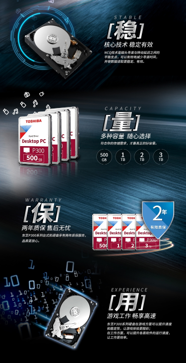 东芝 TOSHIBA P300系列 1TB 7200转64MSATA3台式机硬盘(HDWD110)