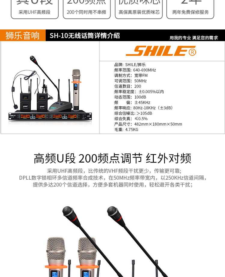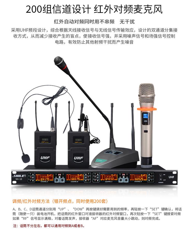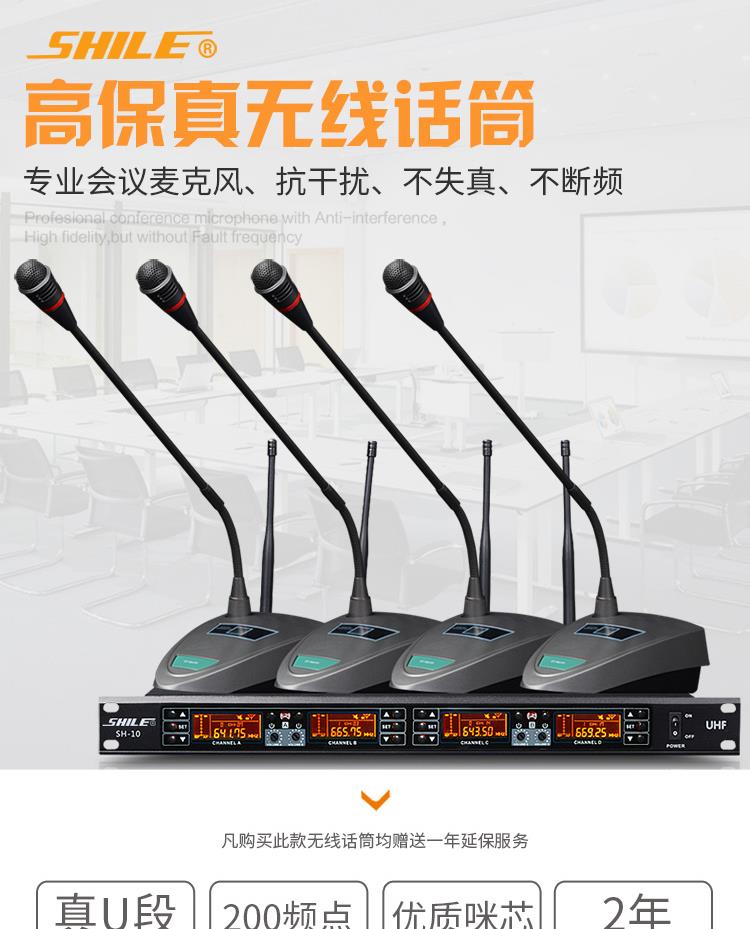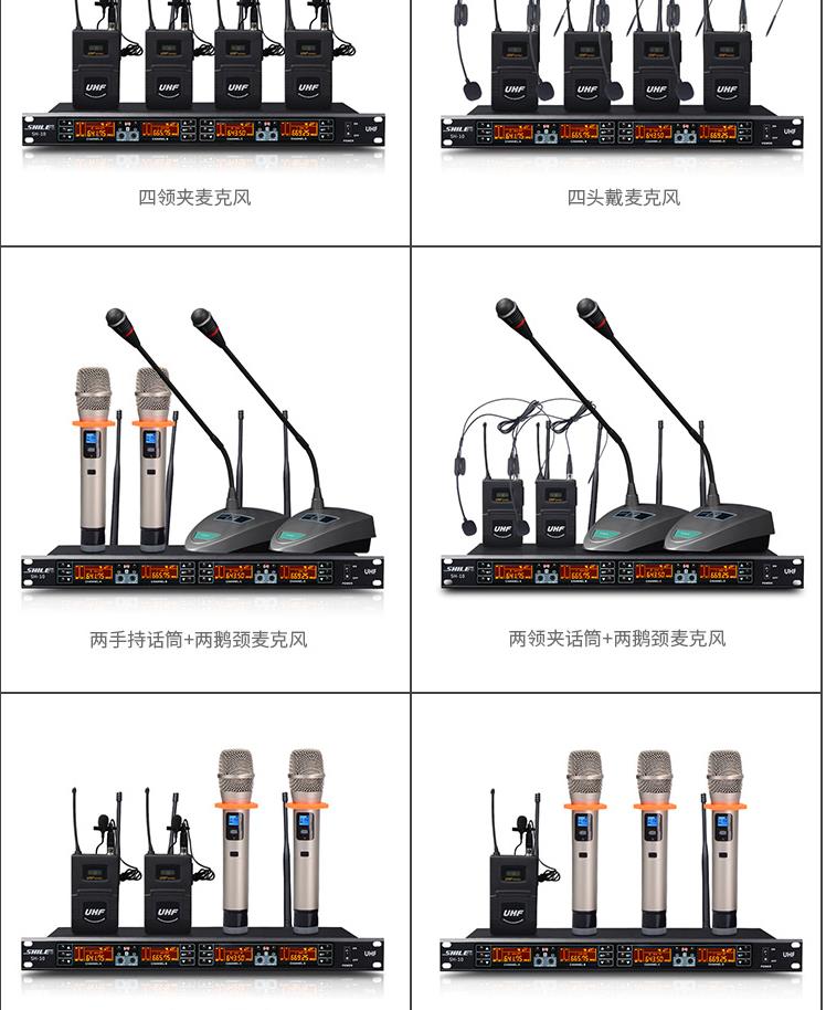 商品名称:狮乐 SHILE SH10U段无线话筒一拖四会议鹅颈手持头戴耳麦领夹培训麦克风套装主机+1只领夹+3只鹅颈话筒