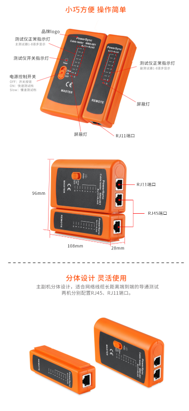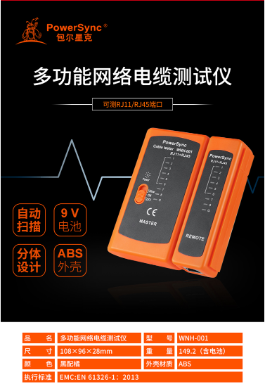 包尔星克 POWERSYNC WNH-001 网络测试仪 108×96×28MM 黑配橘