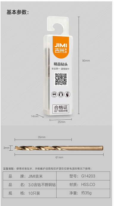 商品名称:吉米家居 JM-G14203含钴钻头手电钻冲击钻头金属不锈钢高速钢麻花钻电动工具配件3MM10支装