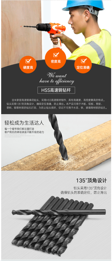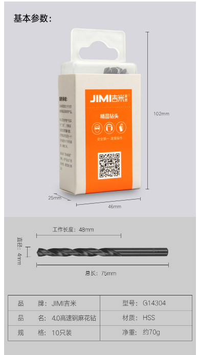 商品名称:吉米家居 JM-G14304高速钢麻花钻头手电钻冲击钻头塑料铜铝木工钻电动工具配件4MM10支装