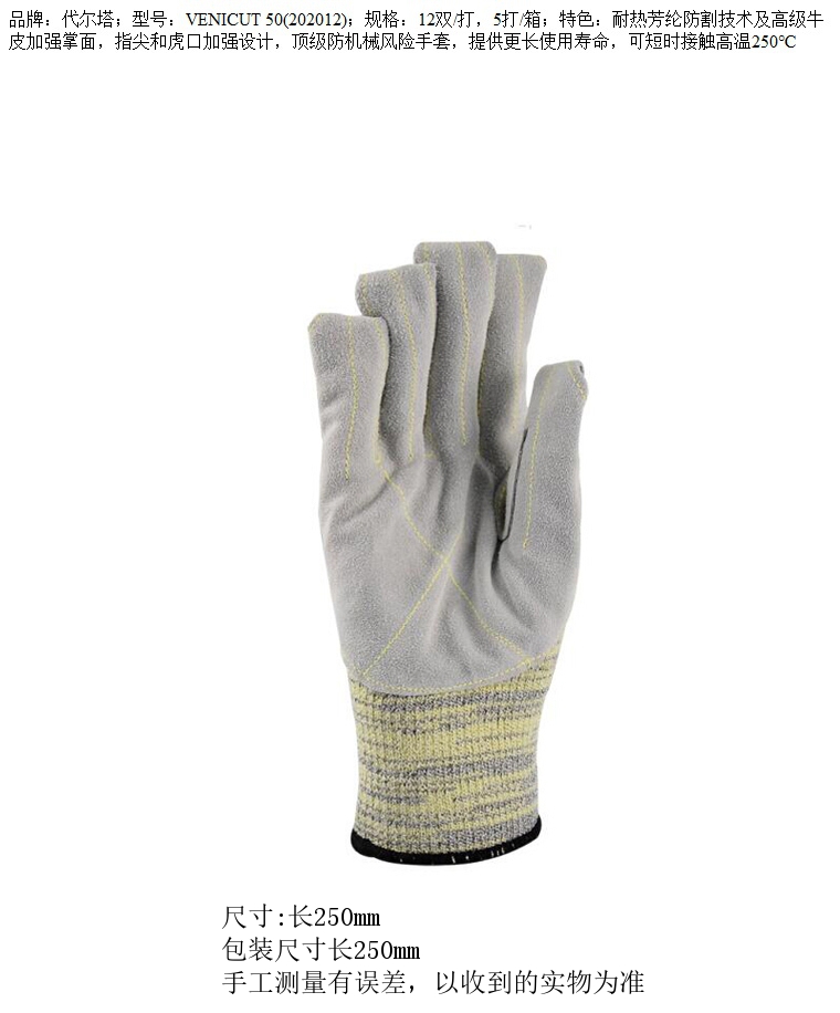 商品名称:代尔塔 VENICUT 50(202012) 12双/打 覆皮加强版防切割手套 灰黄色