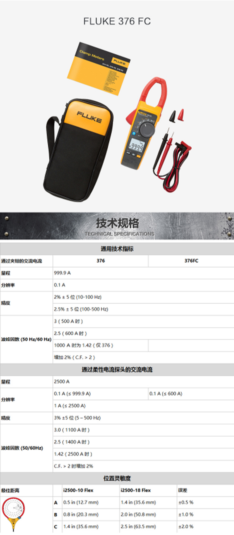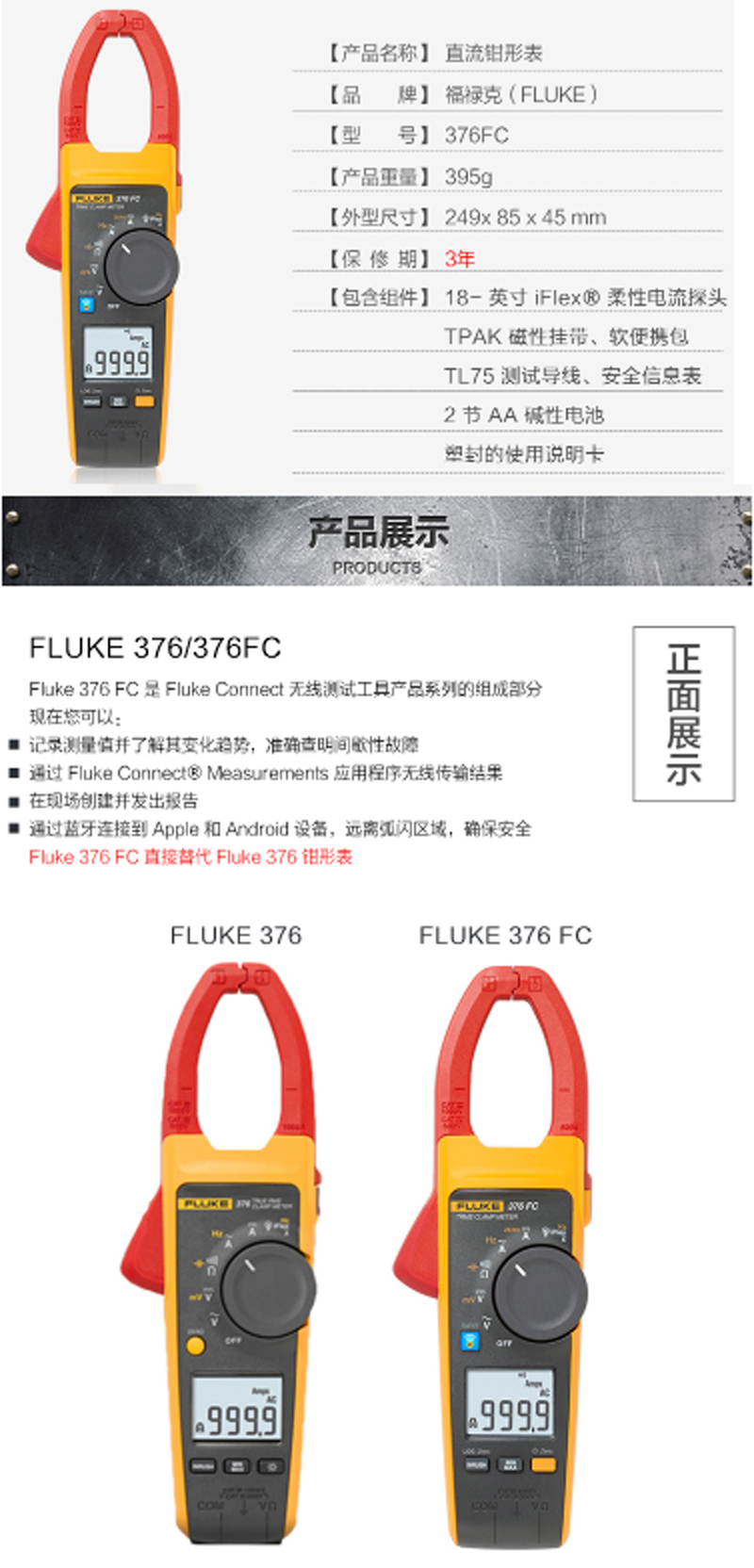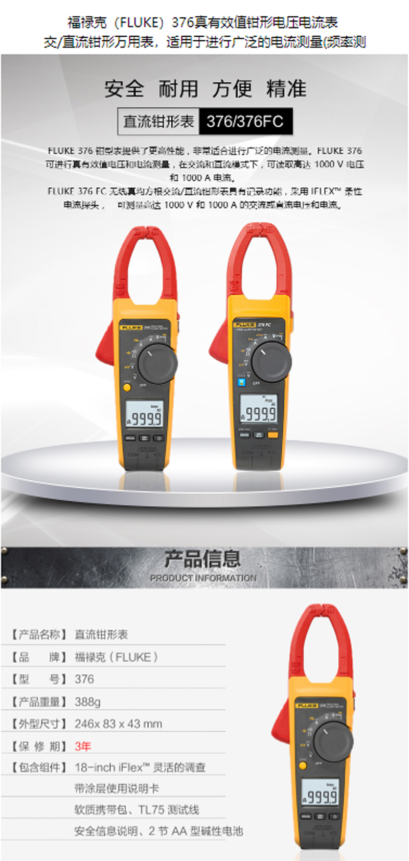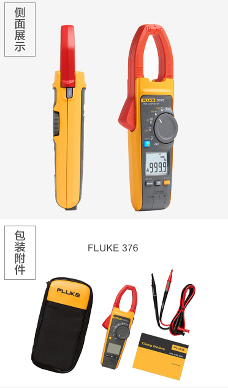 商品名称:☆福禄克 FLUKE 376 真有效值钳形电压电流表交/直流钳形万用表适用于进行广泛的电流测量