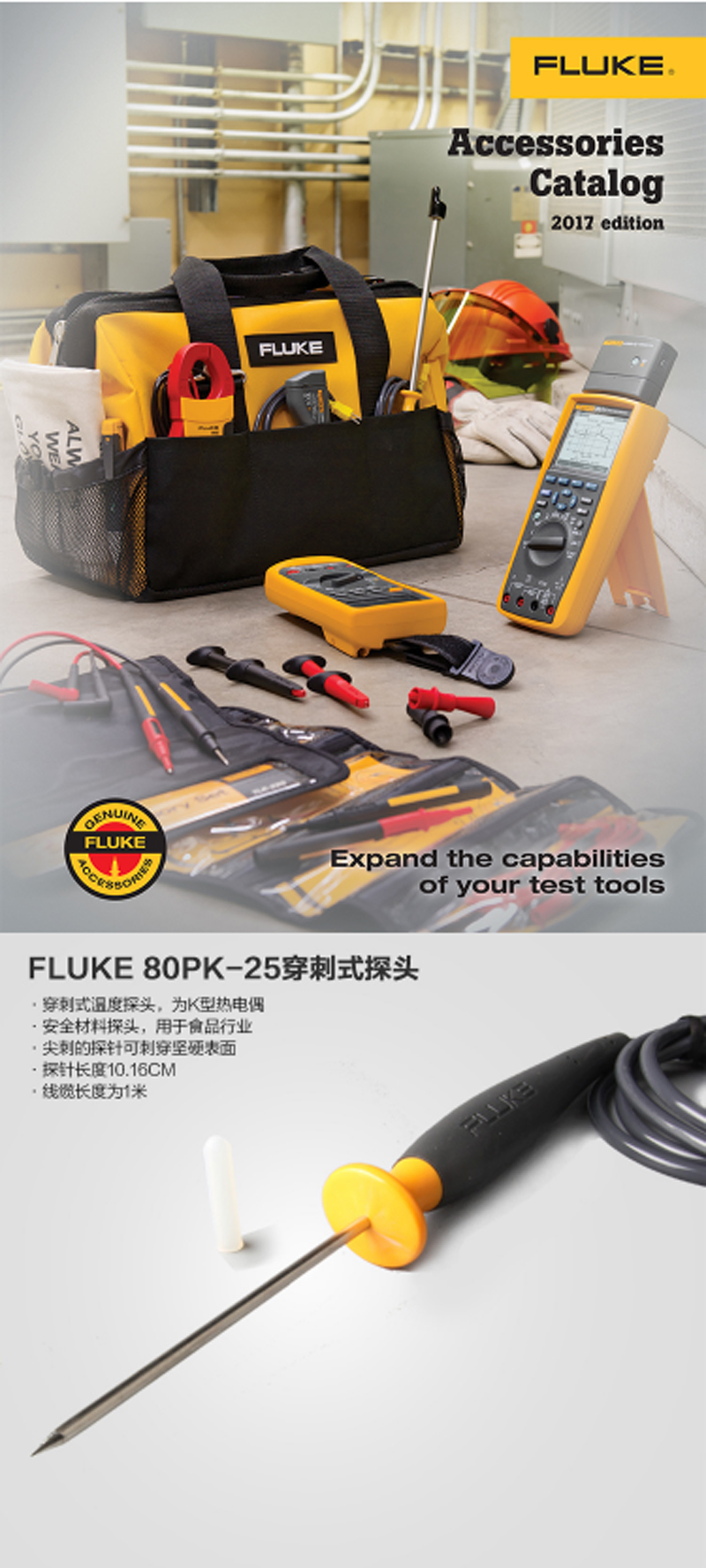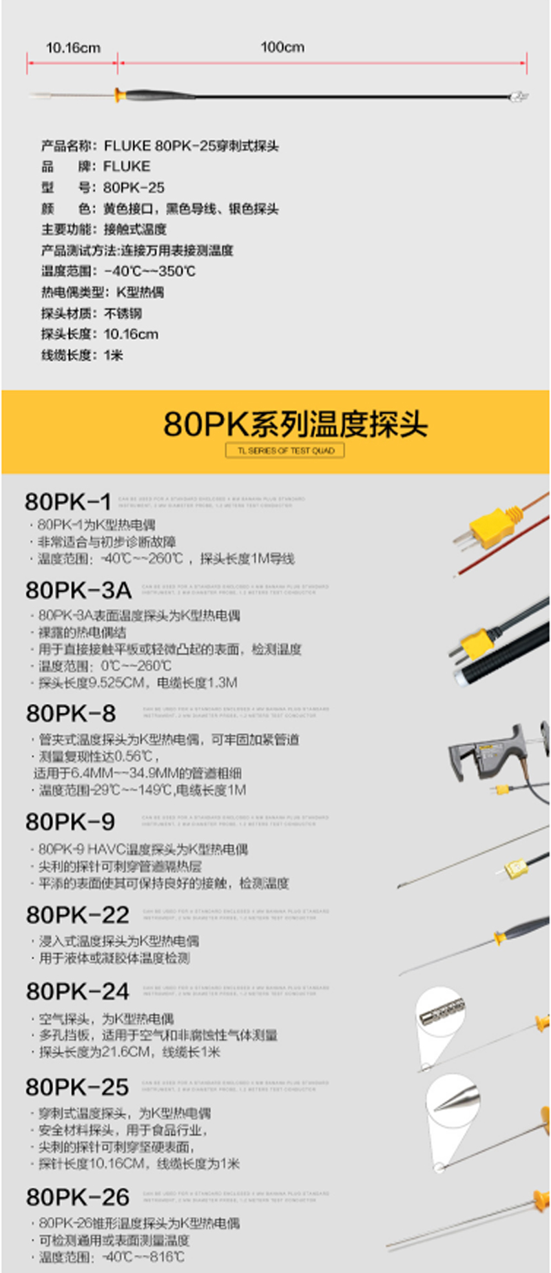 商品名称:☆福禄克 FLUKE 80PK-25 刺穿式探针适用于食品检测可刺穿固体表面测温范围:-40℃至350℃ -40℉至662℉
