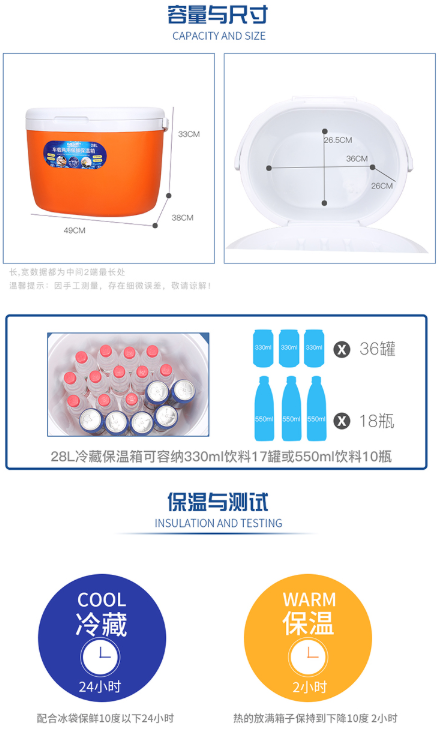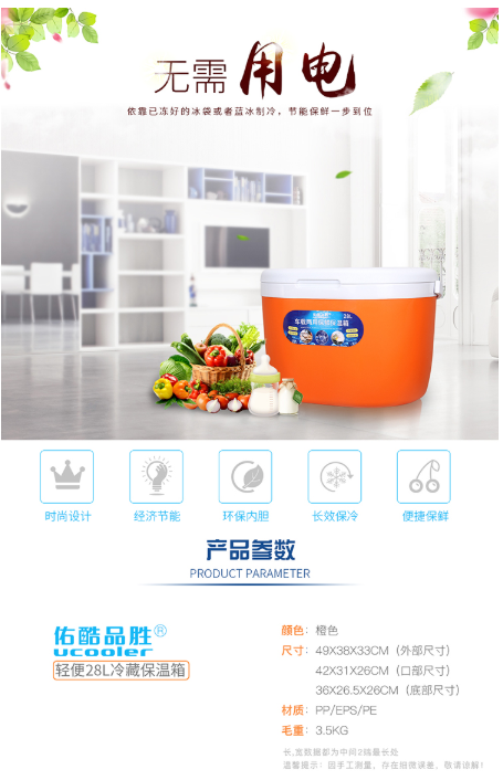 商品名称:佑酷品胜 28L保温箱冷藏箱 椭圆便携家用保温箱母乳保鲜箱血液医药保冷箱车载户外野餐烧烤钓鱼箱橙色