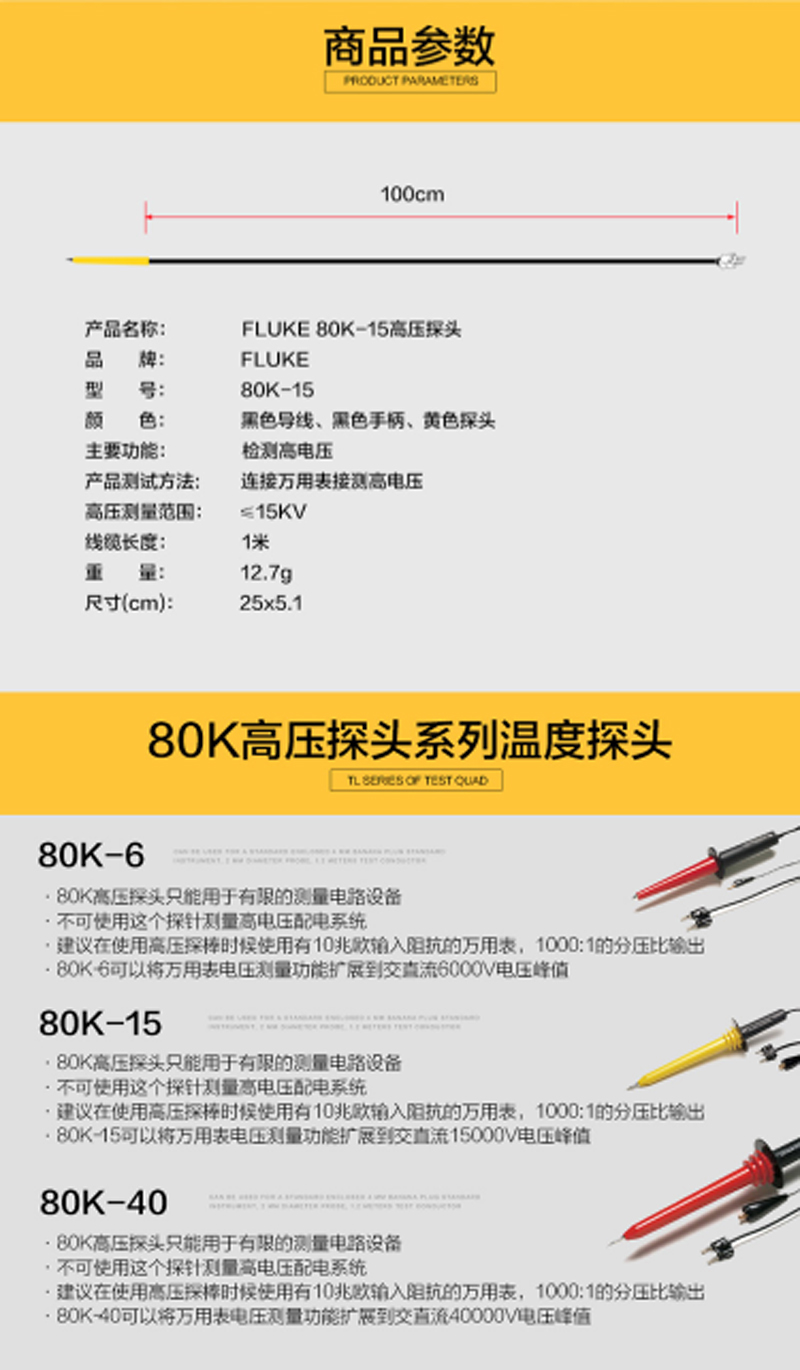 商品名称:☆福禄克 FLUKE 80K-15 高压探头可将数字万用表的量程提高至18000V峰值
