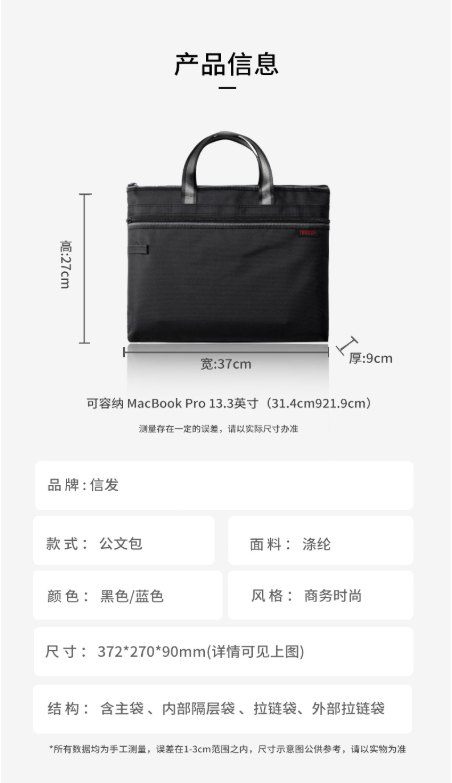 商品名称:信发 TRNFA TN-4005 手提帆布公文包 372×300×30MM 黑色