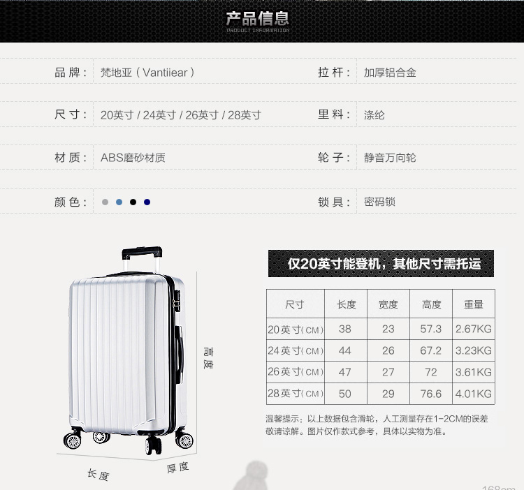 商品名称:梵地亚 VANTIIEAR 旅行拉杆箱 20英寸 黑色