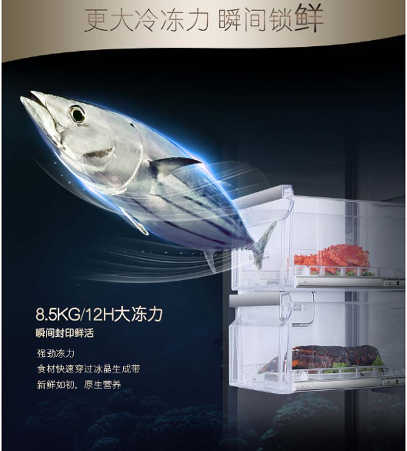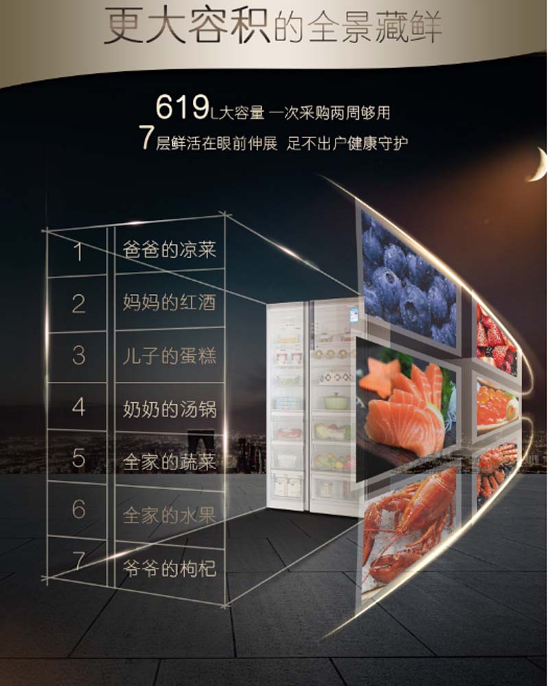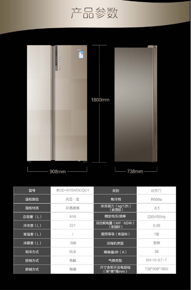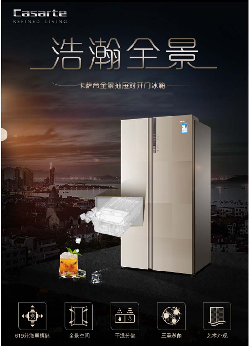 商品名称:卡萨帝 CASARTE BCD-619WDCQU1619升无霜变频对开门冰箱全景抽屉空间三重净化除菌干湿分储风范金