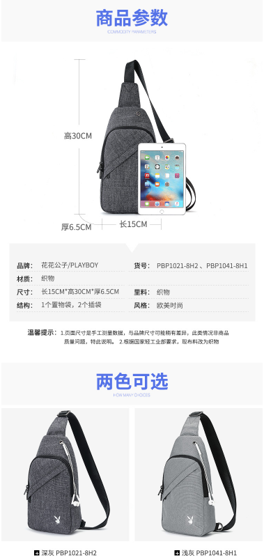 商品名称:花花公子 PLAYBOY PBP1041-8H1 单肩斜挎包 浅灰