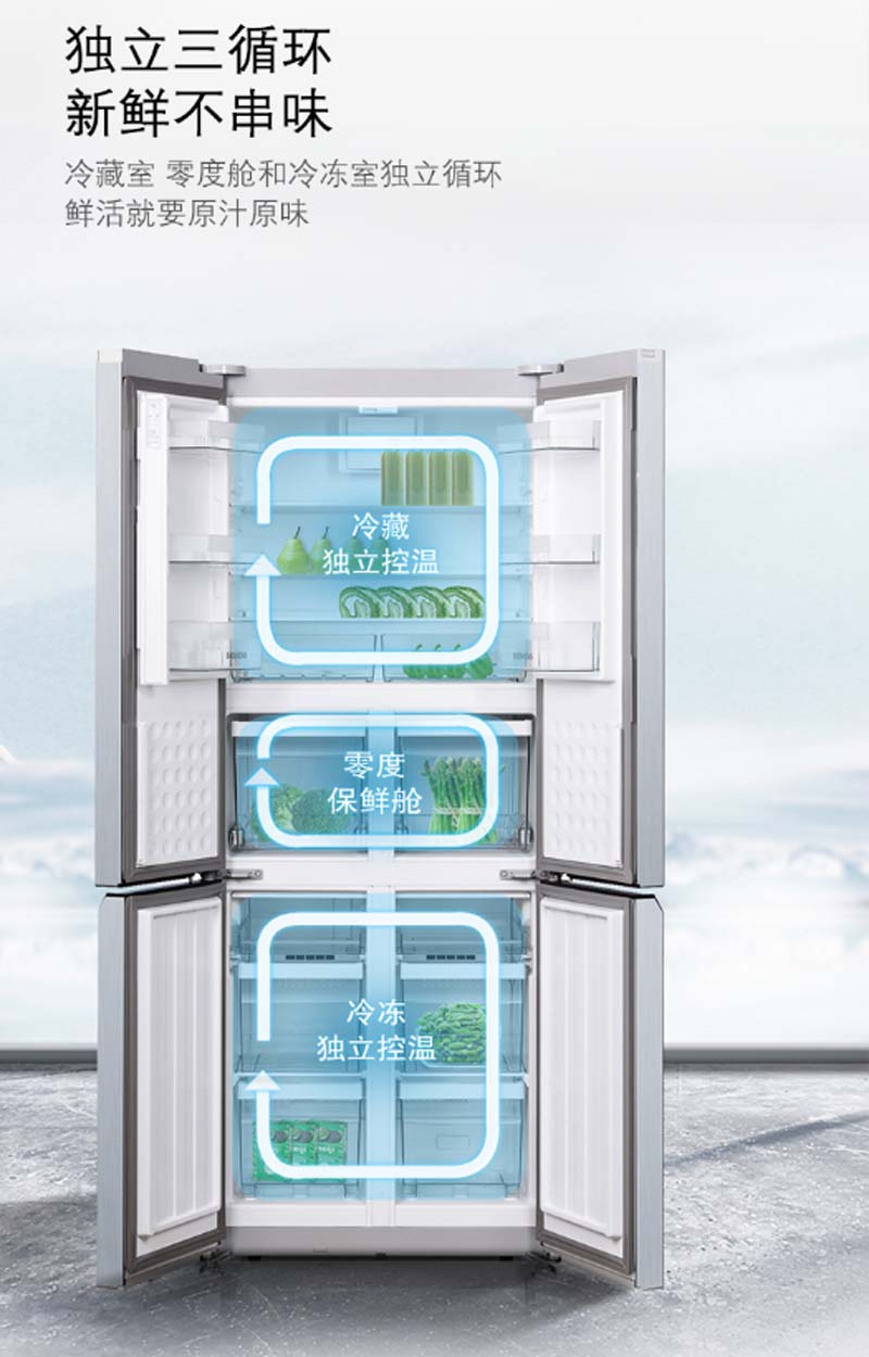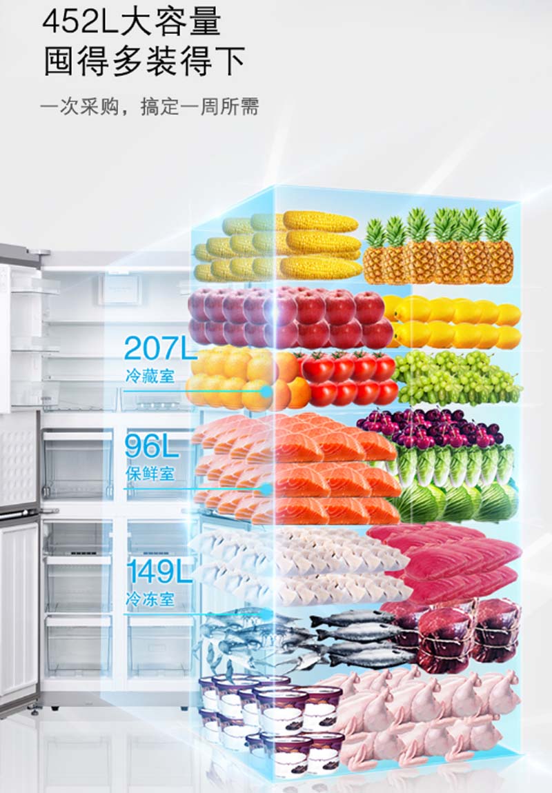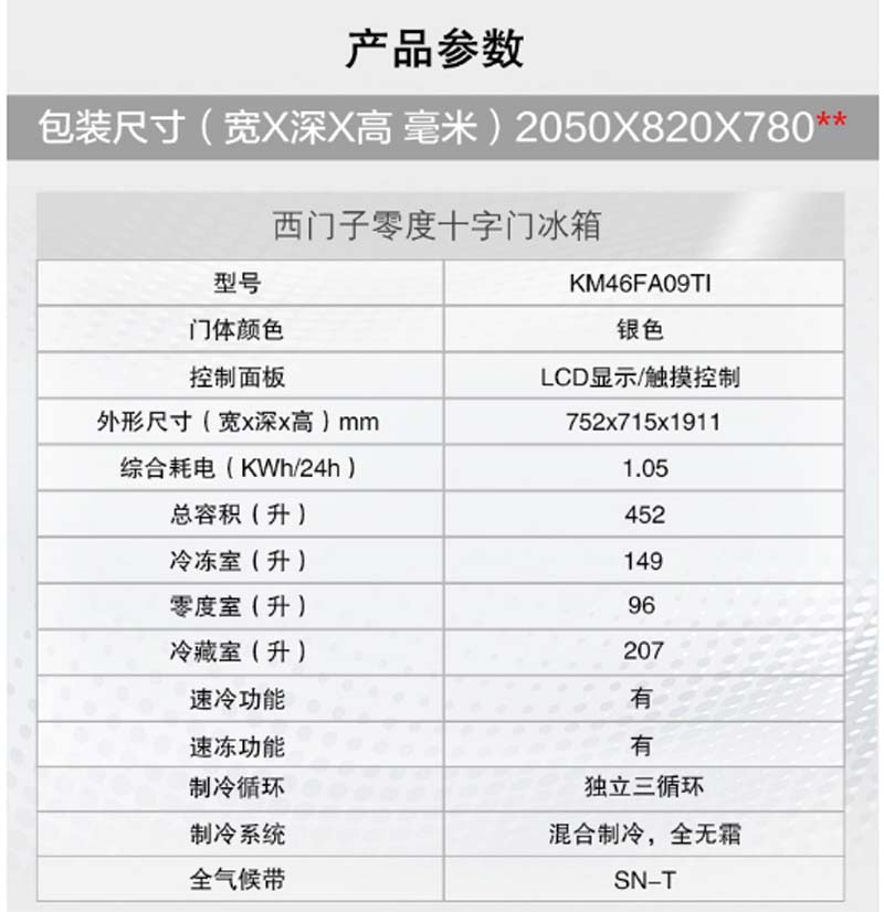 商品名称:西门子 SIEMENS BCD-452W KM46FA09TI 452升 变频混冷 十字对开门多门冰箱 零度保鲜 拉丝银