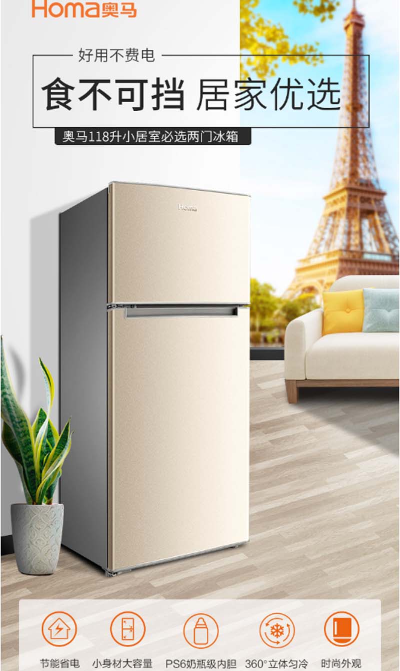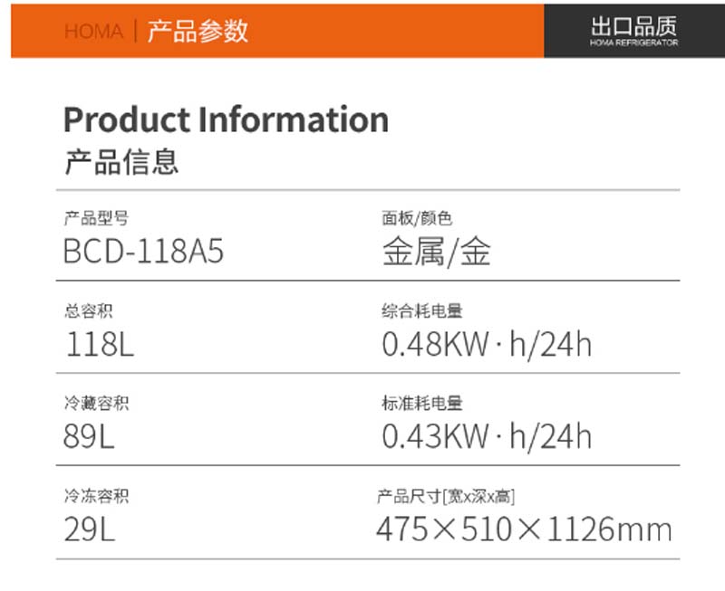 商品名称:奥马 HOMA BCD-118A5 118升 定频 机械控温 冰箱 金色