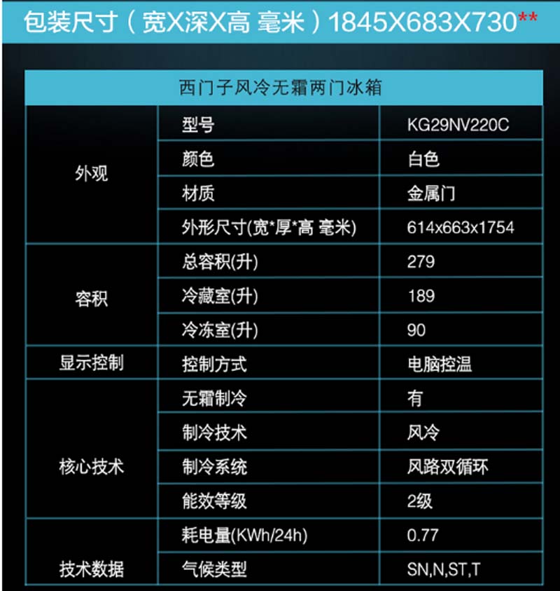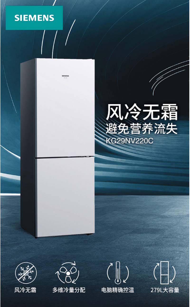 商品名称:西门子 SIEMENS 279升双门冰箱全无霜多维出风节能保鲜 白色 KG29NV220C