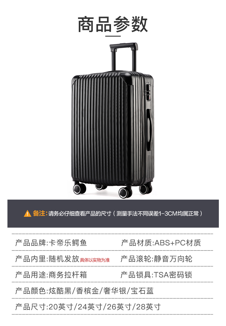 商品名称:卡帝乐鳄鱼 CARTELO 拉杆箱 拉链 万向轮 ABS+铝合金 双杆 20英寸 炫酷黑