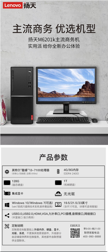 商品名称:联想 LENOVO 扬天 M6201K(I3-7100/4GB/1TB/集成显卡/DOS或LINUX/21英寸)台式机