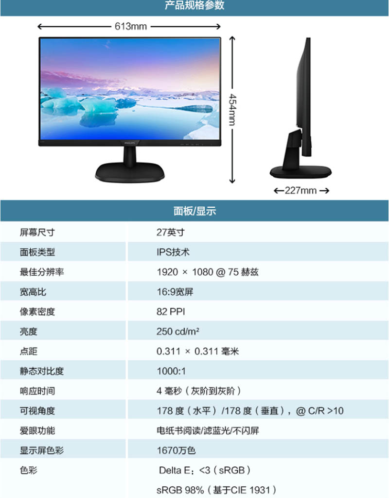 商品名称:☆飞利浦(PHILIPS) 273V7QDSBF (27英寸/1920×1080DPI) 显示器