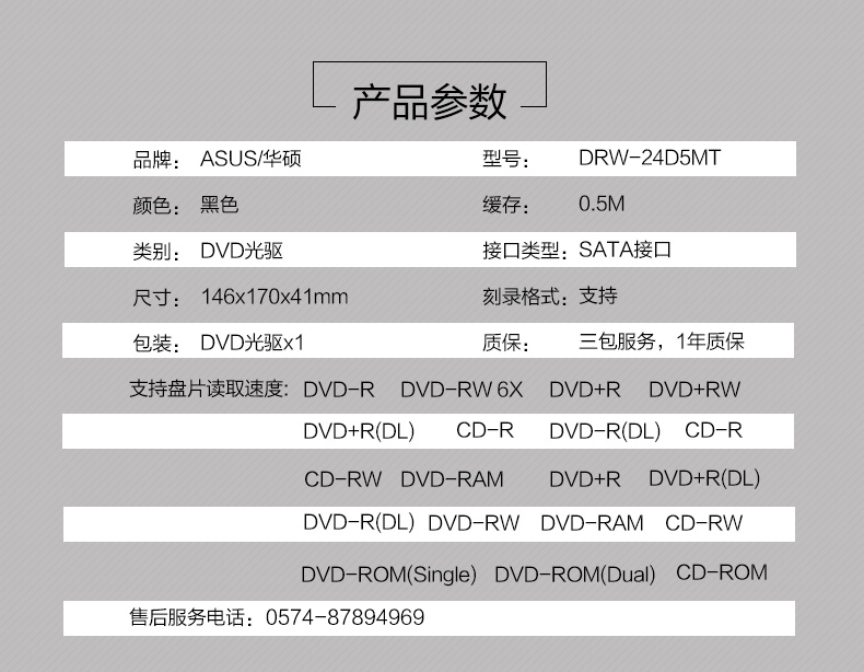 商品名称:☆华硕 ASUS DRW-24D5MT 24倍速 DVD刻录机 黑色