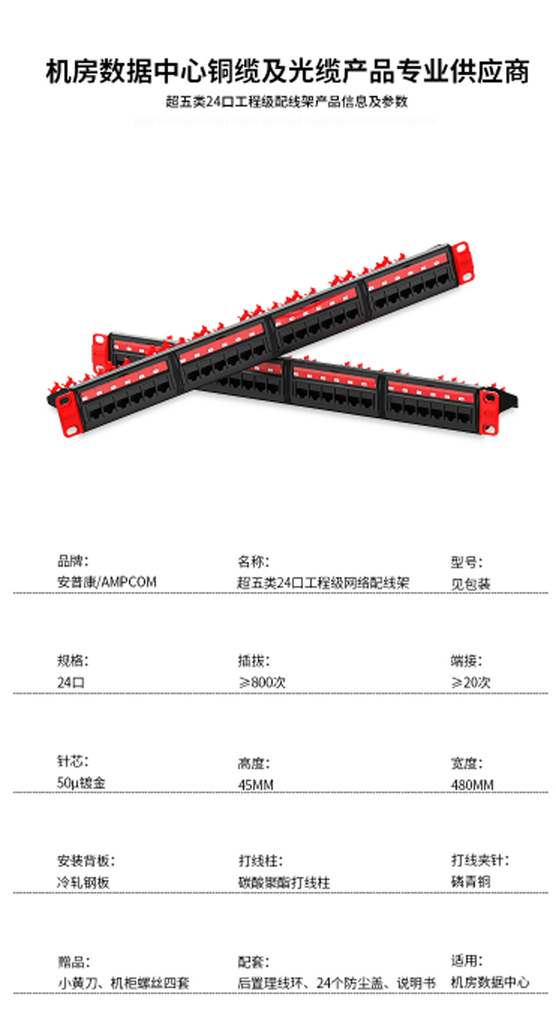 商品名称:☆安普康 AMPCOM 配线架24口超五类网络工程级50U镀金 AMCAT5E1924 2015款