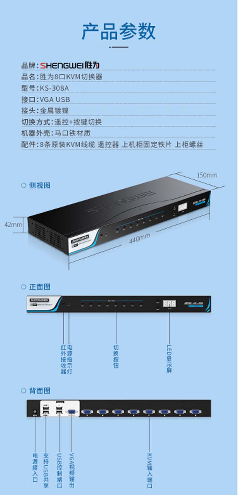 商品名称:☆胜为 SHENGWEI KS-308A KVM切换器 机架式 带遥控 配线 VGA8进1出