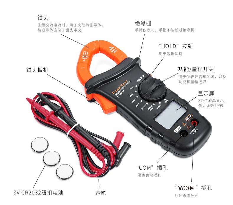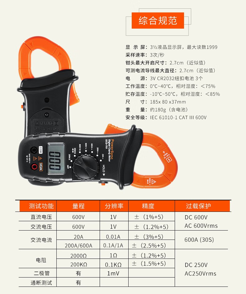 商品名称:☆包尔星克 POWERSYNC DCD-701 数字钳形电流表 万用表 185×80×37MM