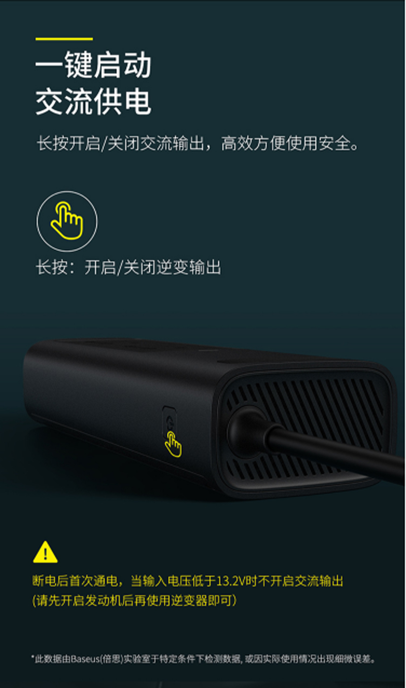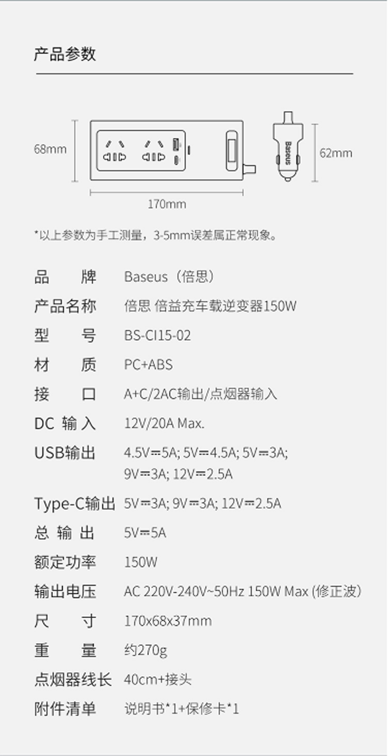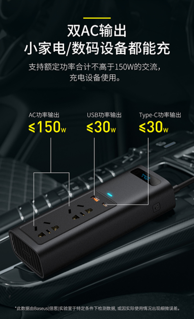 商品名称:倍思 车载逆变器12v转220v电源转换器插座 150W大功率汽车点烟器车载充电器手机快充车用插头