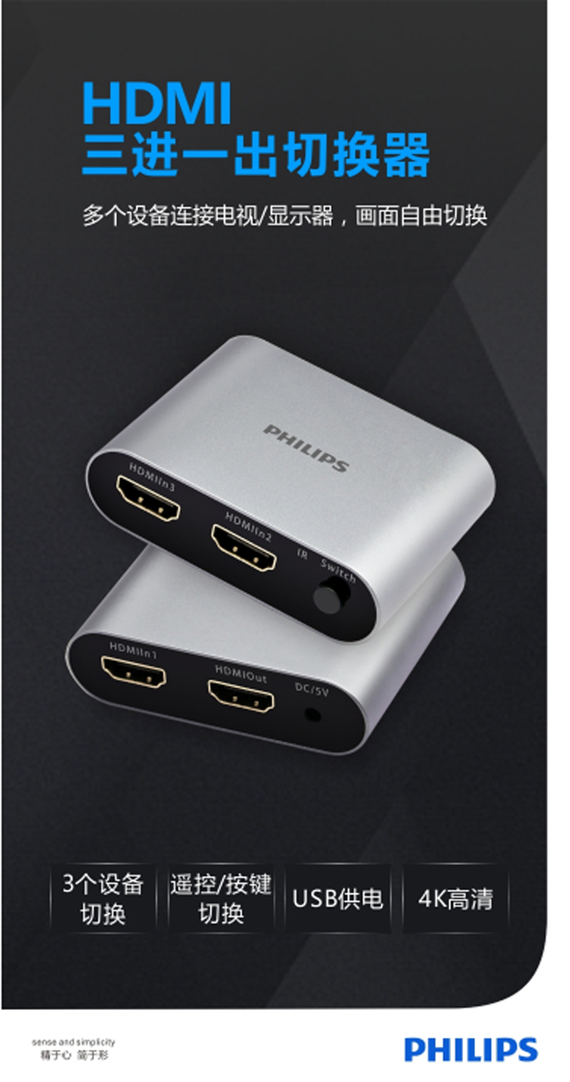 ☆飞利浦 PHILIPS SWR9101B/93 HDMI切换器 三进一出 4K60HZ高清3D视频显示共享分屏器