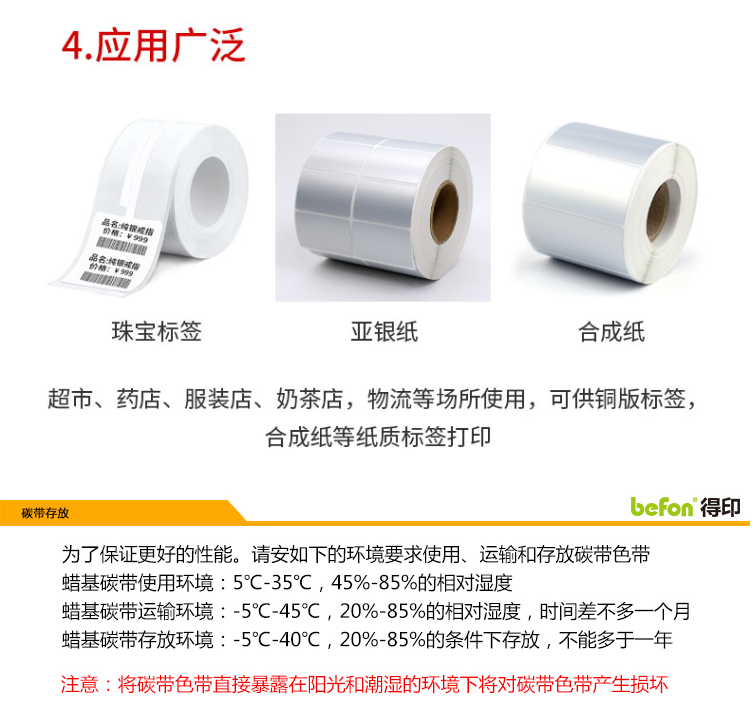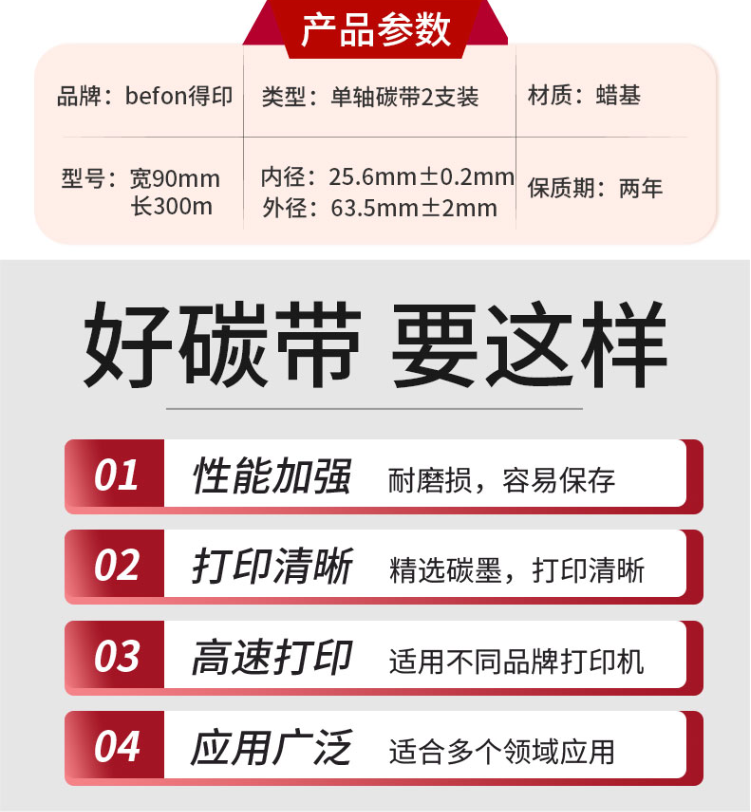 商品名称:☆得印 BEFON 90MM*300M碳带 两支装 蜡基碳带 条码打印机专用色带 标签带